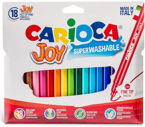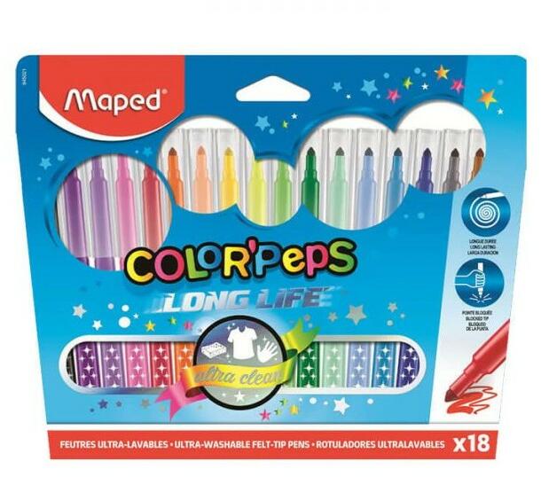 MAPED márkájú 18 színes filctoll ruhából könnyen kimosható, vízbázisú tintával. Közepes vonalvastagságú hegy, amely alkalmas rajzolásra, vagy színezésre. Háromszög alakú, ergonomikus kialakítás a fogórésznél. Nyomásnak ellenálló hegy. Vonalvastagság: 1-4,75 mm.