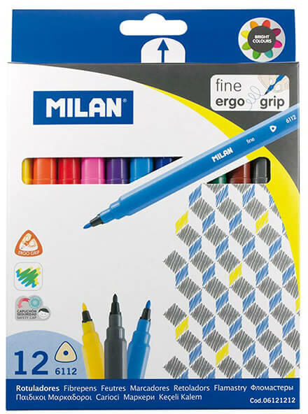 Milan márkájú, kiváló minőségű 12 darabos filctoll készlet. Háromszög filctesttel, mely kényelmes fogás biztosít. Normál vastagságú hegycsúccsal. Ventilációs kupakja van, mely megakadályozza az esetleges fulladást. Toxikus anyagokat nem tartalmaz.