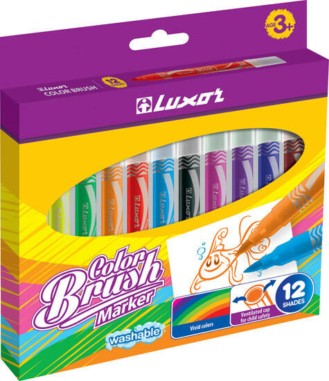Filctoll készlet rajzoláshoz, vagy tanuláshoz. Luxor ecsetirón készlet papír dobozban, 12 db/készlet. Poliészter anyagból készült ecset jellegű hajlékony írócsúcs. Kimosható és lemosható, mérgezőanyag-mentes, vízbázisú tinta. Ideális rajzoláshoz és nagyobb felületek színezéséhez. Szellőző kupakkal.