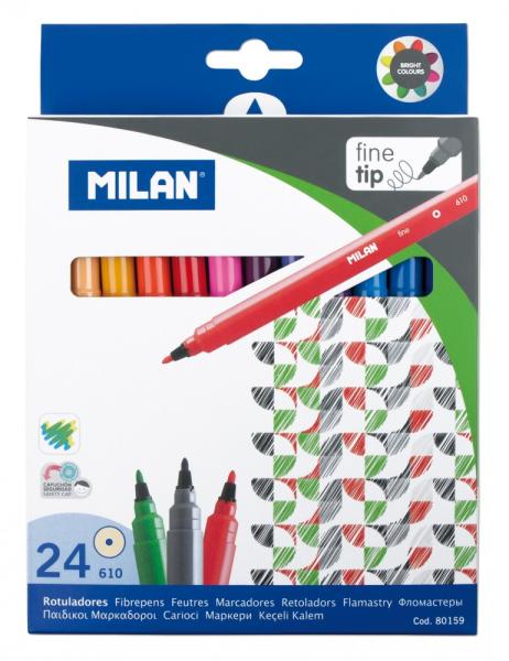 24-es (80159) hengeres testű filctoll (610) készlet, vízbázisú festékkel töltve. Strapabíró, 0,75 mm-es vonalvastagságú filccsúcsa pontos színezést tesz lehetővé. Élénk színű festékei egymással keverhetők és toxikus anyagot nem tartalmaznak. Lélegző (ventilációs), biztonsági kupakjának köszönhetően megvéd a fulladástól a kupak esetleges lenyelése esetén is. Ka