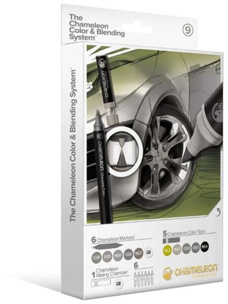 Chameleon Color & Blending System készlet / set n. 9 A Chameleon markerek innovatív, profi szintű alkohol alapú markerek. A Chameleon Color & Blending System készletek a Chameleon Color Tops, a Chameleon Pen markerek és egy blender egyedülálló kombinácioját kínálják, melynek köszönhetően több mint 50 színárnyalatot hozhat létre. A tinta permanens legtöbb felületen, b