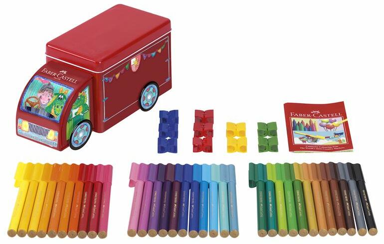 Faber-Castell Filctoll készlet 33db-os, fém teherautóban Tartalma: 33db filctoll + 10db összekötő kupak Filctoll színezéshez, építéshez és játékhoz A speciális csatlakozókupaknak köszönhetően a filctollak könnyen összeilleszthetők Az elforgatható összekötő kapcsok ötletes építkezést és játékot tesznek lehetővé A tollak arra ösztönzik a gyerekeket, hogy nagyszer