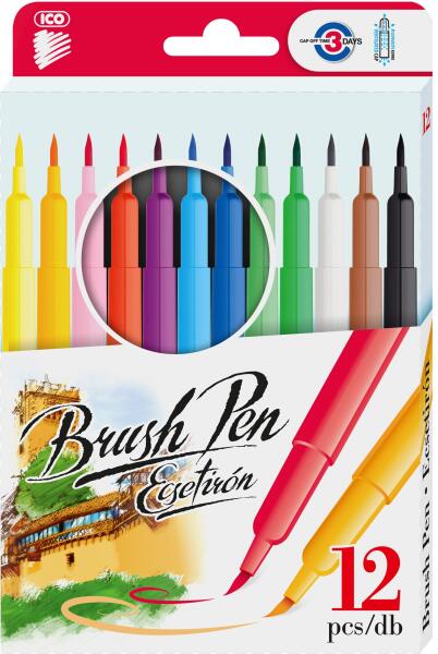 ICO Brush Pen Ecsetirón, Vegyes színű, 12 db Ecset jellegű, hajlékony írócsúccsal ellátott rostirón, rajzolásra, nagyobb felületek színezésére. 12 féle élénk színben. Több mint 500 féle iskolaszert, iskolai terméket kínálunk Grafit- és színesceruzák, rost- és ecsetirónok, ecsetek, festékek, temperák, kréták, gyurmák, ollók, ragasztók, vonalzók, hegyezők, füze