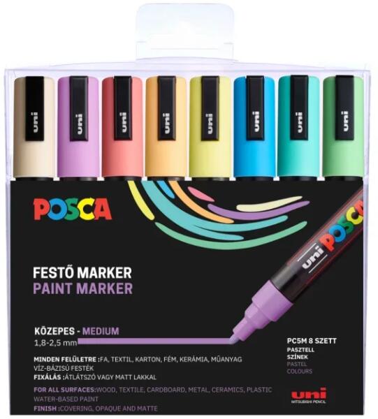 Uni Posca Filctoll PC-5M 8db-os készlet PASZTELL (világosZöld, tengerZöld, barack, korall, napsárga, világoskék, levendula, elefántcsont)Posca egy rendkívül sokoldalú dekormarker. Írásra, rajzolásra, festésre, jelölésre, díszítésre, hobbi tevékenységekhez használható. Műanyagtól kezdve a fém, textil, fa, bőr felületeken is alkalmazható, de az üveg felületeken is kiv
