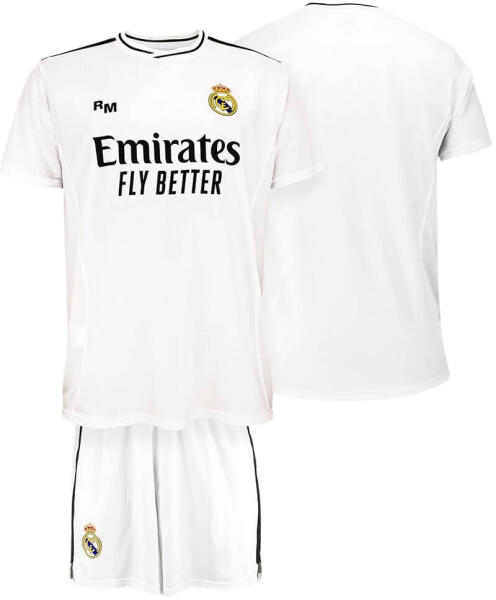 Real Madrid mez garnitúra szurkolói gyerek Anyag: poliészter Gyerek méret Színe: fehér Nyomott csapat logóval, és felirattal. Mosás: kifordított állapotban, mosógépben mosható 30 fokos vízben. Eredeti licences termék, egyenesen Spanyolországból.