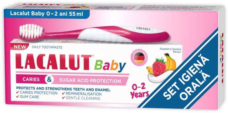 Megjegyzés: Ez a leírás automatikusan le lett fordítva magyarra. Lacalut Baby promóciós csomag: fogkrém 0-2 éves fogszuvasodás és cukor elleni védelem 55 ml + fogkefe Előnyök:Védelem a fogszuvasodás ellenRemineralizációÍnyápolásGyeng d tisztításNem tartalmaz mesterséges színezéket A fluoridnak köszönhetően a fogkrém már az első kitöréstől kezdve megvédi az érzé