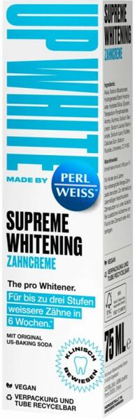 Perl Weiss Up White Supreme Whitening, 75 ml, Fogfehérítő fogkrémek nőknek, A kiváló minőségű Perl Weiss Up White Supreme Whitening fogrém a fogak kíméletes fehérítésére szolgál. Hatékonyan távolítja el a fogak kellemetlen elszíneződését és rendszeres használatát ragyogó mosollyal köszöni meg önnek. Tulajdonságok: fehéríti a fogakat segít leküzdeni a fogszuvaso