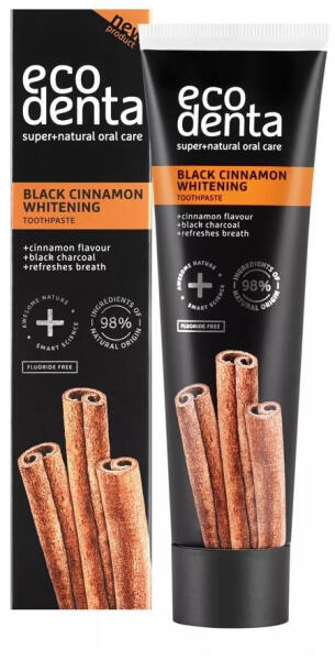 Ecodenta fehérítő fogkrém szénnel és fahéjjal, 100 ml - Az Ecodenta fehérítő fogkrém szénnel és fahéjjal egy természetes összetevőkből készült fogkrém, amely hatékonyan távolítja el a foglepedéket és a foltokat, miközben friss leheletet biztosít- A fogkrém fluoridmentes, ideális az érzékeny fogínyűek számára is- Fluoridmentes, fahéj ízesítésű fogkrém feket