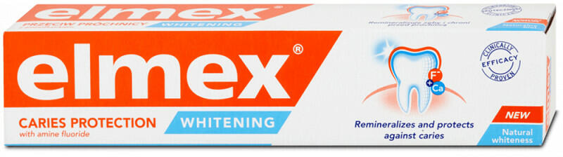 Az Elmex Red Whitening fogkrém egyaránt tökéletes megoldás a fogszuvasodás ellen, és a fogak fehérítésére. Hosszantartó fluorid rétegével gátolja meg a baktériumok elszaporodását, és egyben védelmet nyújt a fogszuvasodás ellen. Mindemellett természetesen fehéríti a fogakat, erősíti a fogzománcot, és biztosítja a friss lehelletet. Összetevők: Aqua, Hydrated silica, S