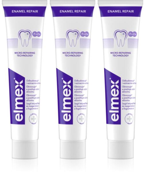 Elmex Repair Enamel Repair, 3x75 ml, Fogfehérítő fogkrémek unisex, A kiváló minőségű Elmex Repair Enamel Repair fogrém a fogak kíméletes fehérítésére szolgál. Hatékonyan távolítja el a fogak kellemetlen elszíneződését és rendszeres használatát ragyogó mosollyal köszöni meg önnek. Tulajdonságok: fehéríti a fogakat garantáltan kíméli a fogzománcot alacsony dörz