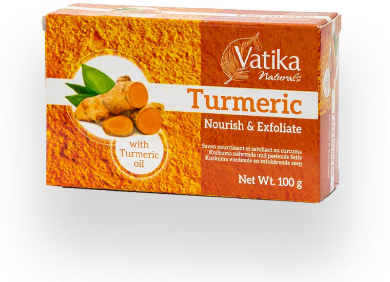 Dabur vatika szappan kurkuma 100 g Kurkuma (turmeric) kivonatot tartalmazó gyógynövényes hámlasztó szappan. INCI: Sodium palmalate, Sodium palm kernelate, Aqua, Parfum (Fragrance), Curcuma longa (Turmeric) root oil, Palmitic acid, Glycerin, Sodium cloride, PEG-75 Lanolin, Tocopheryl Acetate, Pentaerythrityl Tetra-di-t-butyl Hydroxyhydrocinnamate, Disodium EDTA, Tetrasodium Etudronate, Tetras