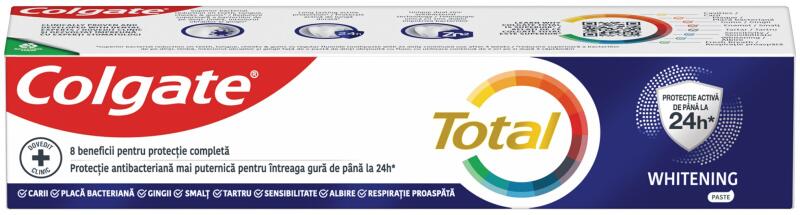 Colgate Total Whitening Fogkrém, 100 ml A magabiztos és vonzó mosoly a ragyogóan fehér fogakban és az egészséges szájüregben rejlik. A Colgate Total Whitening fogkrém egyedi formulája éppen ezért nemcsak a fogfelszíni elszíneződések eltüntetésében nyújt segítséget a fehérebb fogakért, hanem a teljes száj egészségének érdekében 12 órán át* csökkenti a fogakon, a