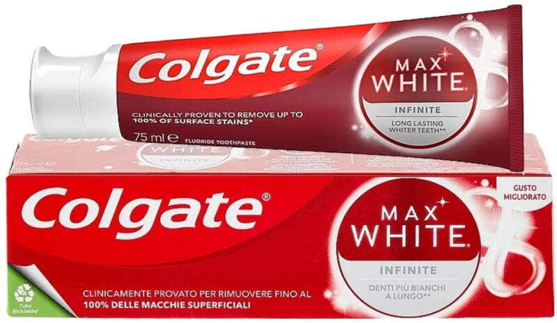 Colgate FOGKRÉM 75ml - Max White - Infinite A Colgate Max White Infinite fogkrém segítségével mindenkit elvarázsol maga körül mosolyával! Speciális formula akár 100%-ban eltávolítja a fogak felületi elszíneződését. Rendszeres használatával a fogkrém csökkentheti a lepedéket, és erősítheti a fogzománcot és az egészséges fogínyt. Így fogai hosszú távon védettek és