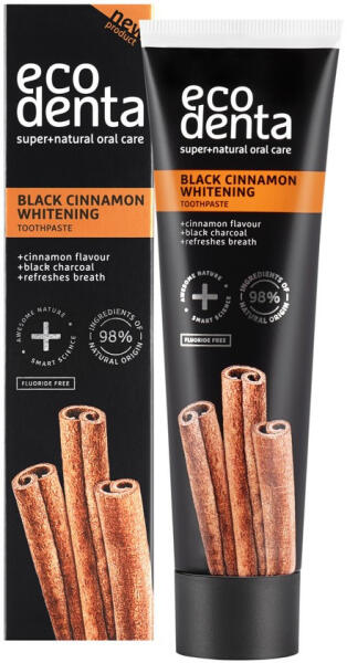 Az Ecodenta Fehérítő fogkrém szénnel és fahéjjal egy természetes összetevőkből készült fogkrém , amely hatékonyan távolítja el a foglepedéket és a foltokat, miközben friss leheletet biztosít. A fogkrém fluoridmentes, ideális az érzékeny fogínyűek számára is. Fluoridmentes, fahéj í zesítésű fogkrém fekete szénnel. Ecodenta Fehérítő Fogkrém Fluoridmentes Fahé