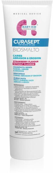 Curasept Biosmalto Baby-Kid, 50 ml, Fogkrémek gyermekeknek gyermekeknek, A kifejezetten gyermekeknek kifejlesztett Curasept Biosmalto Baby-Kid fogkrém tökéletesen tisztítja, fehéren és egészségesen tartja a kicsik fogait. Tulajdonságok: kellemes ízű védi a fogínyt hatékonyan védi a fogakat eltávolítja a lepedéket az első fogak tisztítására ajánlott Összetétel: fluoridment
