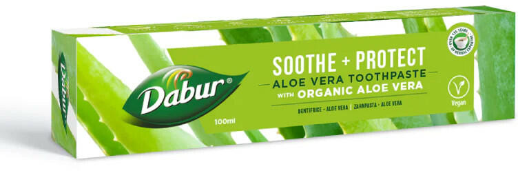 Teljeskörű fogápolást nyújtó, organikus aloe vera kivonatot, és más gyógynövényeket tartalmazó fluoridmentes fogkrém. Az organikus aloe vera kivonattal készült Dabur Soothe + Protect nyugtató, fogínyápoló, gyulladáscsökkentő hatású gyógynövényes, fluoridmentes fogkrém egy gyengéd, természetes fog- és ínyvédő összetevők egyedülálló keverékével gazdagított f