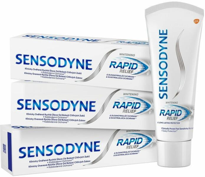 3X Sensodyne fogkrém rapid relief Rapid Relief 75 ml FEHÉRÍTÉS Fogkrém, amely 60 másodpercen belül enyhíti az érzékeny fogak fájdalmát, és egyben fehéríti a fogzománcot, és segít megelőzni a foltok kialakulását. A gyorsan kezdődő Sensodyne Rapid Whitening fogkrém klinikailag bizonyítottan enyhíti az érzékeny fogak fájdalmát. Az ón-fluorid helyreállítja a védőrét