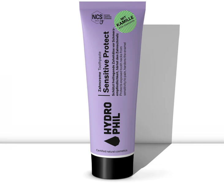 Fluoridtartalmú, vegán, SLS-, és parabénmentes fogkrém. Tökéletes támogatást nyújt az érzékeny fogak számára. Ökológiai gazdálkodásból származó kamilla-kivonattal nyugtatja az érzékeny fogínyt és fognyakat. Friss leheletet biztosít a borsmenta illóolajnak köszönhetően. Nátrium-fluoridot tartalmaz. NCS minősítéssel rendelkező natúrkozmetikum. A HYDROPHIL Sensitiv