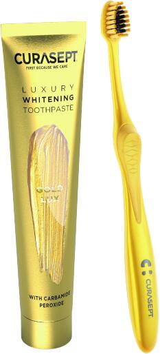 Curasept Gold Lux Set, , Fogkrémek unisex, A legszebb az egészséges és ragyogóan fehér fogsor. Ez a kozmetikai készlet Curasept Gold Lux Set olyan fogápolást tud biztosítani, amelynek köszönhetően fogai gyönyörűek lesznek, és Ön mindig mosolyogni fog. A szett tartalma: Gold fogkefe aktív szénnel 1 db fehérítő fogkrém 75 ml Tulajdonságok: fehéríti a fogakat garantáltan k