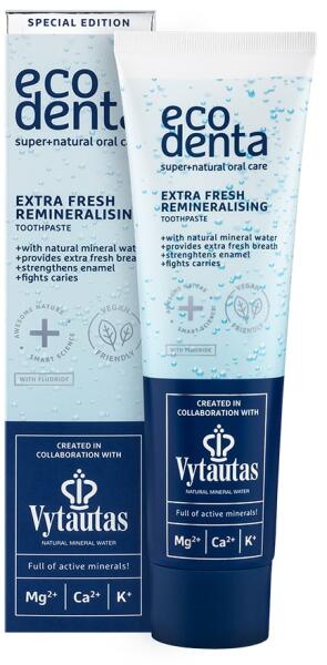 Ecodenta remineralizáló fogkrém ásványvízzel, 75 ml - Fehérítő hatású fogkrém, amely természetes módon frissen tartja a leheletet - Természetes ásványvíz tartalma van, amelyet Európa egyik legrégebbi természeti parkja - a Nemunas Loops Regional Park - talajából nyernek - Magnéziummal, kalciummal és káliummal dúsítva erősíti a zománcot és remineralizálja a fogakat -