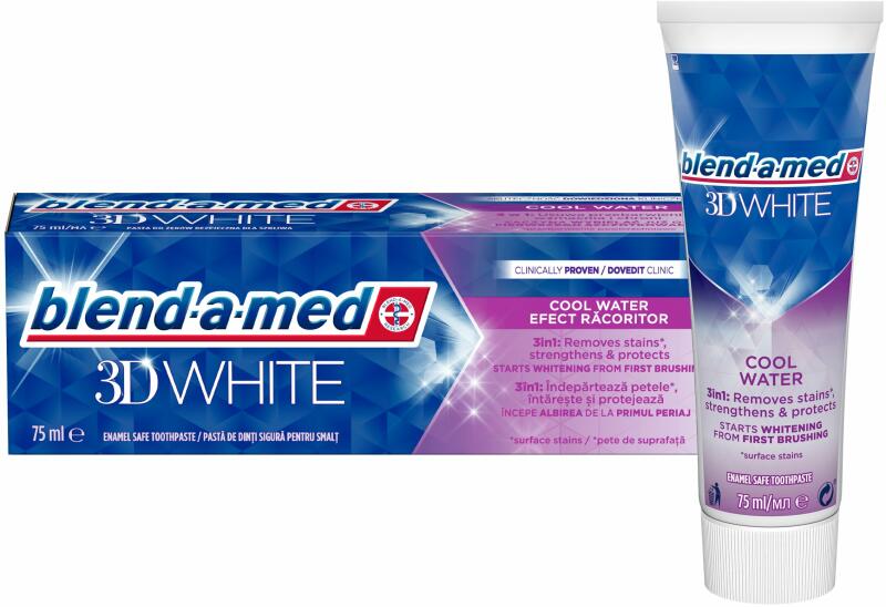 Termékleírás Jellemzők 3 az 1-ben hatás: eltávolítja a felületi elszíneződéseket, valamint erősíti és óvja a fogakat, Már az első fogmosással megkezdi a fogfehérítést, Klinikailag igazolt, Ragyogóan fehérré varázsolja mosolyát Termék információk A Blend-a-med 3D White Cool Water klinikailag igazolt, 3 az 1-ben hatású fogkrém: eltávolítja a felületi elszíneződé