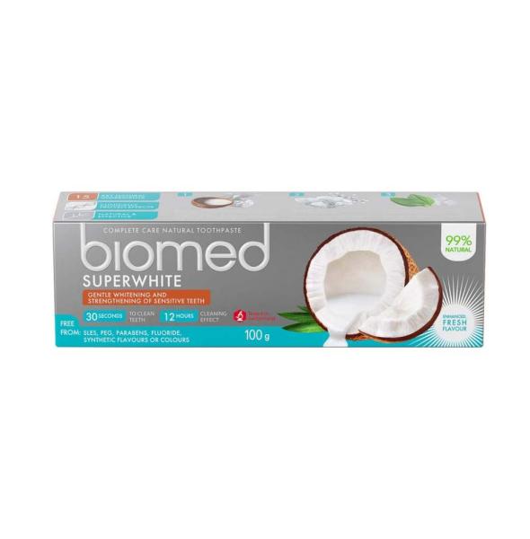 Gyártó: Biomed Modell: Superwhite 100 g Leírás: A fluoridmentes BIOMED Superwhite fogkrémet kifejezetten az érzékeny fogak számára fejlesztették ki. Eredményesen tisztít és megerősíti a fogzománcot, ragyogó megjelenést kölcsönöz a fogaknak. A benne található kókuszolaj és fahéj megnyugtatja az ínyt, ugyanakkor pikáns, egyedi ízt kölcsönöz a fogkrémnek. A kalcium-hi