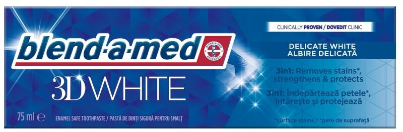 Gyártó: Blend-a-med Modell: 3D White Delicate White 75 ml Leírás: A klinikailag igazolt Blend-a-med 3D White Delicate White 3 az 1-ben hatású fogkrém: eltávolítja a felületi elszíneződéseket, már a legelső használattól kezdve fehérít, illetve erősíti és óvja a fogakat. Tulajdonságok: 3 az 1-ben hatás: eltávolítja a felületi elszíneződéseket, valamint erősíti és ó