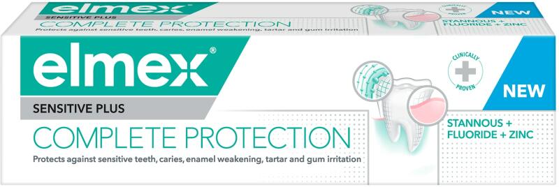 Gondoskodjon érzékeny fogairól az elmex sensitive plus complete protection fogérzékenység elleni fogkrémmel! a fogkrém kifejezetten az érzékeny fogakhoz lett kifejlesztve. A fogkrém ón-fluorid és cink-foszfát tartalmának köszönhetően védelmet nyújt a teljes száj egészségéért. Napi használat esetén: - védelmet nyújt az erős fogak és az egészséges fogíny megőrzés