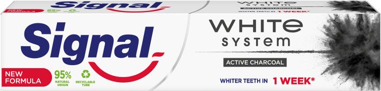 Termék információk A Signal White System fogkrém aktív szén hozzáadásával a természetesen fehérebb és ragyogóbb mosolyért akár 1 hét alatt*. Nézze meg a csomagoláson a legfrissebb információkat, összetevőlistát, mert azok változhatnak. *Rendszeres, napi 2 fogmosás mellett, 55 alanyon végzett klinikai vizsgálat alapján. " Márka információk A Signalnál már közel 100