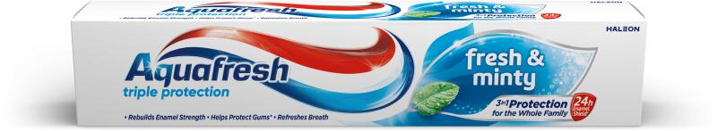 Aquafresh Fresh & Minty Fogkrém - 3 az 1-ben Védelem az egész családnak Termékleírás: Az Aquafresh Fresh & Minty egy klinikailag bizonyított fogkrém, mely 3 az 1-ben védelmet nyújt az egész családnak. Ez a kiváló minőségű fogkrém helyreállítja a fogzománc erősségét, védőpajzsot hoz létre a fogak védelmére, és segít védeni az ínyt*. Főbb jellemzők: 3 az 1