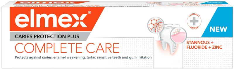 ELMEX FOGKRÉM CARIES PROTECTION PLUS COMPLETE CARE 75ML - az elmex Anti-Caries Professional Plus Complete Care fogkrém on-fluoridot és cinket is tartalmazó complexformulája egyszerre véd a fogszuvasodás -, a fogkő képződés -, a fogérzékenység -, a zománc vesztés - és az íny irritáció ellen. Összetevők: Aqua, Calcium Carbonate, Glycerin, Arginin, Sodium Lauryl Sulfate, Sodium