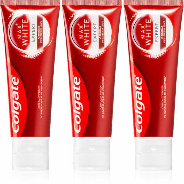 Colgate Max White Expert Original, 3x75 ml, Fogkrémek férfiaknak, A kiváló minőségű Colgate Max White Expert Original fogrém a fogak kíméletes fehérítésére szolgál. Hatékonyan távolítja el a fogak kellemetlen elszíneződését és rendszeres használatát ragyogó mosollyal köszöni meg önnek. Tulajdonságok: fehéríti a fogakat frissíti a leheletet garantáltan kíméli a f
