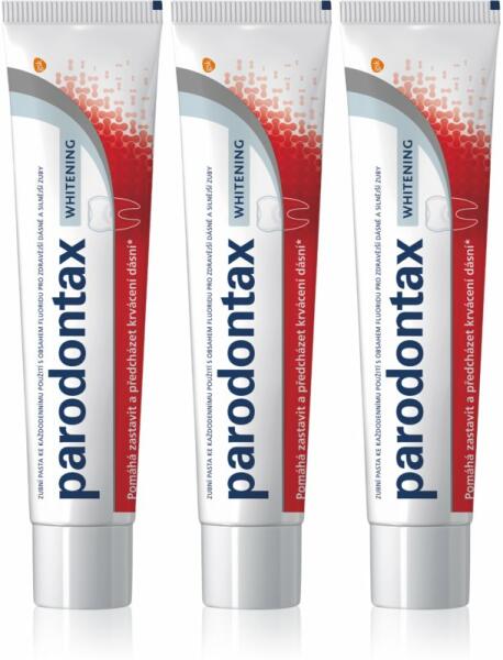 Parodontax Whitening, 3x75 ml, Parodontózis ellen férfiaknak, A kiváló minőségű Parodontax Whitening fogrém a fogak kíméletes fehérítésére szolgál. Hatékonyan távolítja el a fogak kellemetlen elszíneződését és rendszeres használatát ragyogó mosollyal köszöni meg önnek. Tulajdonságok: fehéríti a fogakat segít leküzdeni a fogszuvasodást és a foglepedéket csökken