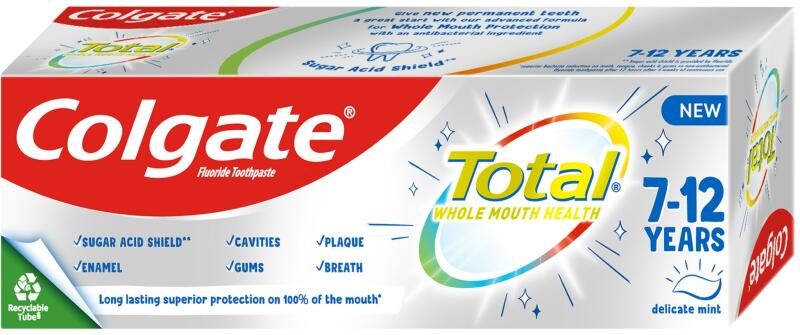 Gondoskodjon gyermekei maradandó fogainak és egészségüknek megőrzéséről a Colgate márkájú fogkrémmel. Ez a termék 7 és 12 év közötti gyerekek számára lett kifejlesztve, mivel fejlett formulája hosszantartó és kiemelkedő védelmet biztosít az egész szájüreg számára. A fluoridot és antibakteriális adalékot tartalmazó formula hatékonyan küzd a cukorsav ellen és v