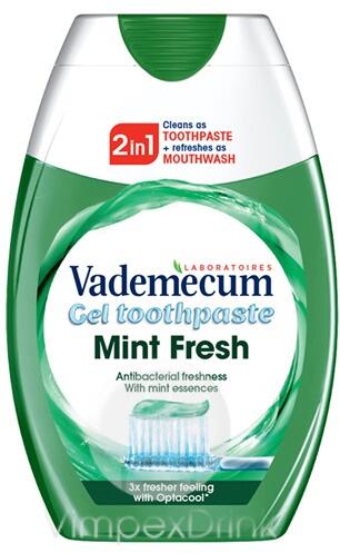 Gyártó: Vademecum Modell: Mint Fresh 2in1 75 ml Leírás: Vademecum 2in1 Mint Fresh Gel gél állagú fogkrém, mely frissít, mint egy szájvíz. Antibakteriális frissesség menta kivonattal. Kizárólag felnőttek számára. Nátrium-Fluoridot tartalmaz (1450 ppm F⁻). Használata: Naponta legalább kétszer 2 percig mossa fogait, használjon fogselymet és látogassa rendszeresen fogorvosá