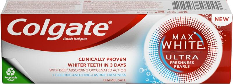 Az új generációs fehérítő tudományunk a fogzománc károsítása nélküli fehéríti fogaid és tünteti el a mély elszíneződéseket fehérebbé téve fogaid mindössze 3 nap alatt!* Hagyományos fehérítő fogkrémekhez képest, amik csak a fog felületi elszíneződéseit tüntetik el, a Max White Ultra Freshness Pearls fogkrém forradalmian új mélyre ható oxigénnel dúsított ha
