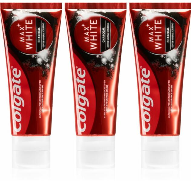 Colgate Max White Charcoal, 3 x 75 ml, Fogkrémek férfiaknak, A kiváló minőségű Colgate Max White Charcoal fogrém a fogak kíméletes fehérítésére szolgál. Hatékonyan távolítja el a fogak kellemetlen elszíneződését és rendszeres használatát ragyogó mosollyal köszöni meg önnek. Tulajdonságok: fehéríti a fogakat eltávolítja a fogkövet és a foglepedéket frissíti a l