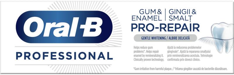 Gyártó: Oral-B Modell: Professional Gum & Enamel Pro-Repair Gentle Whitening 75 ml Leírás: Az Oral-B Professional Gum & Enamel Pro-Repair Gentle Whitening fogínyvédő és zománchelyreállító fogkrém csökkenti a fogíny-irritációt és már 2 hét alatt segít a fogzománc helyreállításában – meggyengült fogzománcon végzett laboratóriumi vizsgálat alapján. Különleg