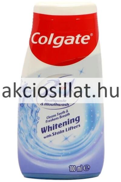 Colgate Whitening 2in1 Toothpaste & Mouthwash 100ml – Fehérítő Fogkrém és Szájvíz Egyben Ragyogó mosoly egy lépésben! A Colgate Whitening 2in1 fogkrém és szájvíz innovatív formulája egyesíti a fogfehérítés és a leheletfrissítés erejét. A fluoridtartalmú összetevők segítenek megelőzni a fogszuvasodást, miközben a folteltávolító technológia gyengéden vissza