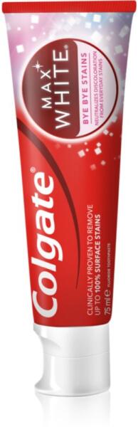 Colgate Max White Bye Bye Stains, 75 ml, Fogfehérítő fogkrémek unisex, A kiváló minőségű Colgate Max White Bye Bye Stains fogrém a fogak kíméletes fehérítésére szolgál. Hatékonyan távolítja el a fogak kellemetlen elszíneződését és rendszeres használatát ragyogó mosollyal köszöni meg önnek. Tulajdonságok: fehéríti a fogakat segít leküzdeni a fogszuvasodást és a