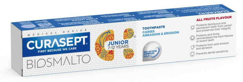 A Curasept Biosmalto Junior fogkrém7-12 éves gyermekek számára ajánlott. 1450 ppm fluoridot tartalmaz. Megvédi a tej- és maradandó fogakat a fogszuvasodástól és megőrzi épségüket. Ezenkívül védi és remineralizálja a fogak kemény szöveteit, valamint véd a savas erózió és a kopás ellen. Megakadályozza a fogérzékenységet. Kellemes tutti frutti ízben, így minden bizonn