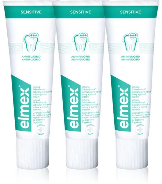 Elmex Sensitive, 3x75 ml, Az érzékeny fogakra unisex, Az érzékeny fogak ápolására szolgáló Elmex Sensitive fogkrém garantálja, hogy használatával a hideg és forró italokat is kellemetlen érzékes nélkül fogja tudni élvezni. Intsen búcsút a fokozottan érzékeny fogaknak. Tulajdonságok: csökkenti a fogak érzékenységét