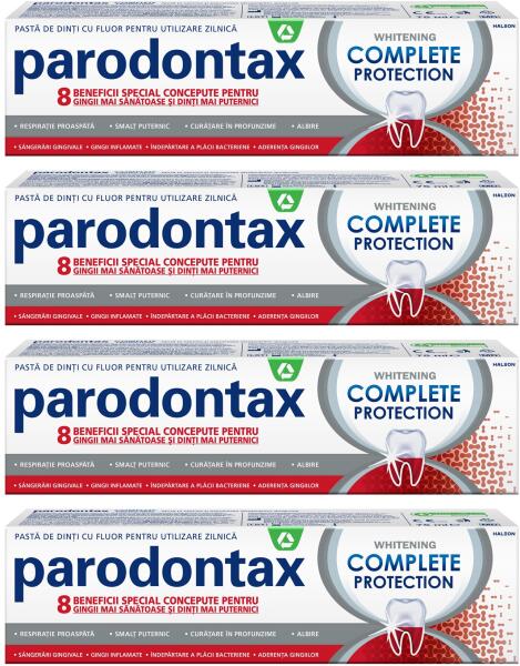 Parodontax Complete Protection Whitening fogkrém készlet, 75 ml x 4 db 8 előnyt kínál, amelyeket kifejezetten az egészségesebb fogíny és az erősebb fogak érdekében terveztek: Segít megállítani és megelőzni az ínyvérzést* Csökkenti az ínygyulladást; Segít fenntartani az íny tapadását; Frissíti a lélegzetet; Tisztítsa meg alaposan; Segít helyreállítani a fogak termé