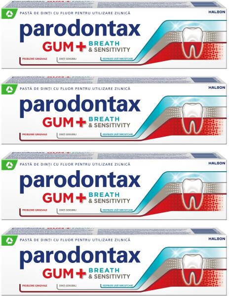 Parodontax gumi + Breath & Sensitivity Whitening fogkrém készlet, 75 ml x 4 db A Parodontax Gum+ Breath & Sensitivity fluoridos fogkrém tudományosan bizonyítottan véd az ínyproblémák, a rossz lehelet és a fogérzékenység ellen. Előnyök: Mélyen megcélozza a bakteriális lepedéket az interdentális terekben Védőréteg kialakításával segít megvédeni az érzékenységet
