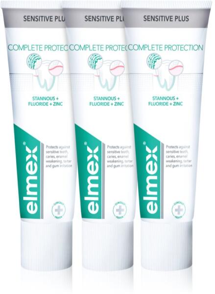 Elmex Sensitive Plus Complete Protection, 3x75 ml, Komplett védelemért unisex, A kiváló minőségű Elmex Sensitive Plus Complete Protection fogkrém gondoskodik a fogai és a fogínye teljes körű ápolásáról. Megtisztítja a fogait a foglepedéktől és az ételmaradékoktól, közben ápolja fogínyt és a szájüreg nyálkahártyáját. Tulajdonságok: megbízhatóan tisztítja a fogak