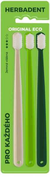 A finom szálas kefe rizsszalma műanyagból készült. A Herbadent Original Eco fogkefék cseh fogorvosokkal és dentálhigiénikusokkal együttműködésben készültek, és megfelelnek a modern fogápolás követelményeinek. Egyenes vágott nagyon finom nylon szálakkal vannak felszerelve. Egy kis kefefejjel kombinálva lehetővé teszik számukra, hogy tökéletesen alkalmazkodjanak a fog fel