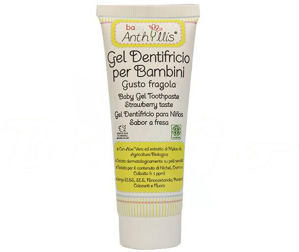 Anthyllis bio fogkrém 75 ml ICEA tanúsítvánnyal rendelkező baba fogkrém aloe verával, mályvával és természetes aromával. Kíméletesen tisztító eperízű fogkrém. Segít megelőzni a fogszuvasodást, és biztosítja a száj higiéniáját. A fogkrém aloe vera és biogazdálkodásból származó mályva kivonata nyugtatja a fogínyt. Kellemes ízű. Felhasználás: Napi egy fogmosá
