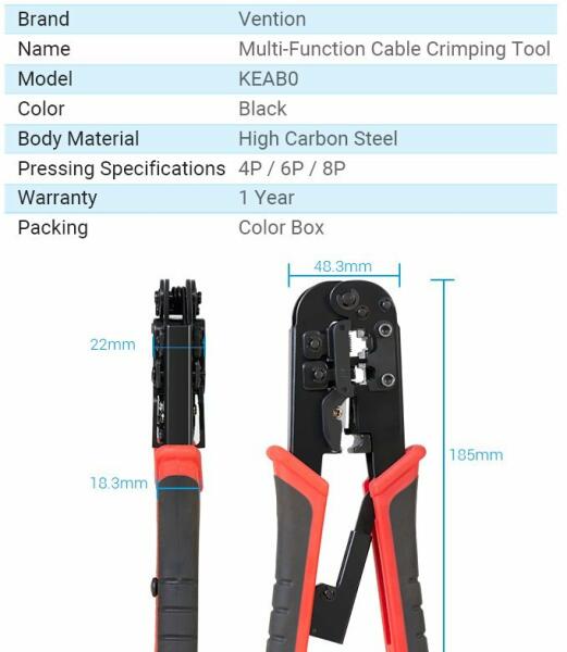 Vention KEAB0 multifunctional cable crimping tool with ratchet (black). The Vention KEAB0 multifunction tool is an indispensable piece of equipment in the hands of electrical and telecommunications professionals, as well as for DIY projects. It will work great not only for crimping cables, but also for stripping insulation and cutting. Made of extremely strong high-carbon steel, it ensures not onl