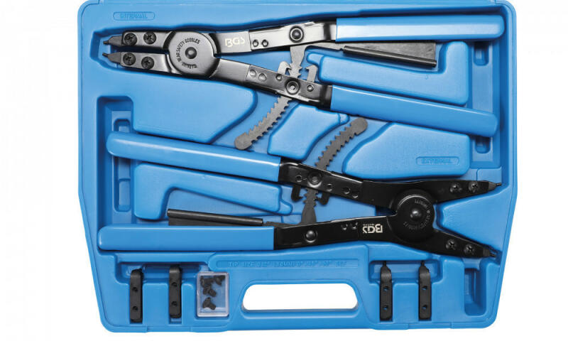 Angol nyelvű leírás (a magyar fordítást lásd lejjebb):one pair of ratchet pliers each for internal and external clips3 pairs of exchangeable tips Ø 3 mm for each pair of plierscirclips easy to adjust because of the ratcheting functionfor inner circlips from 16 to 80 mmfor outer circlips from 11 to 73 mmfor motor trucks and agricultural machinesincludes the following tools:pliers for externa