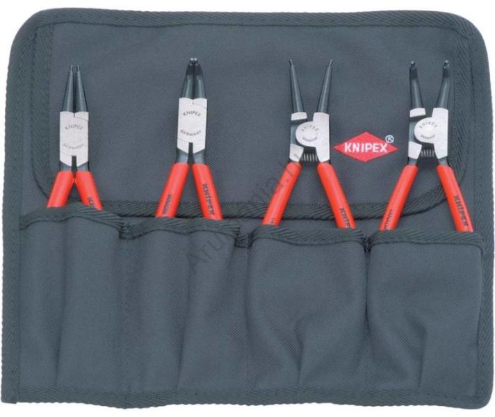 Rögzítőgyűrű fogókészlet 4 részes Jellemzők: praktikus, állítható gyors zárral · benne négy gyakran használt külső és belső rögzítőgyűrű fogóval · Összetekerhető, strapabíró, poliészter szövet táskában Műszaki adatok: Alkalmas furat átmérő: 19-60 mm · Alkalmas tengelyátmérők: 19-60 mm · Anyag: Króm-vanádium acél · Anyagjellemző: Edzett · Gyártói